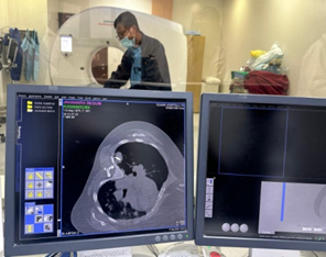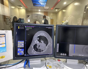 Histopathology: Core biopsy of one pulmonary nodule revealed diffuse infiltration by atypical lymphoid cells. Immunohistochemistry demonstrated positivity for CD20, confirming Non-Hodgkin’s lymphoma, B-cell type.