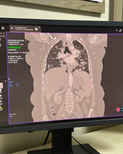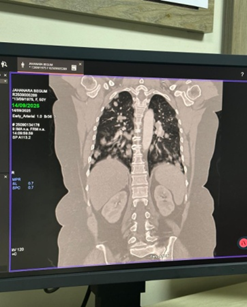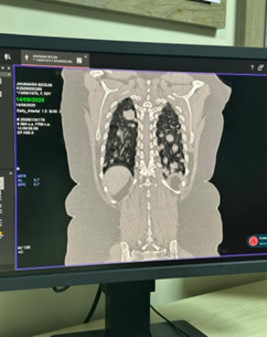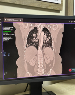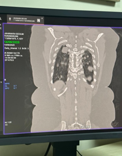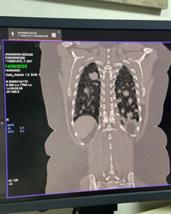 • CT chest demonstrated numerous, variable-sized nodules scattered throughout both lungs, with no mediastinal mass, pleural effusion, or consolidation.