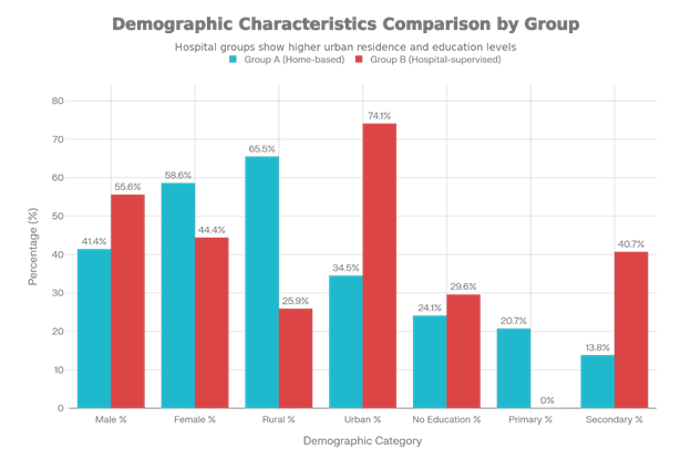 In our study, the hospital group had richer people who lived in the city. The people from villages preferred home care because traveling is hard for them. Since this was not a random choice for everyone, the richer people picked the hospital more often.6